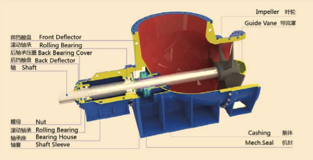 (2)叶轮与吸入导管配合,在输送磨蚀性物料时,只要更换吸入导管即可,从而提高泵体的使用寿命。轴封可采用型阻液式填料密封和双端面机械密封,确保泵无泄漏,安全可靠;
